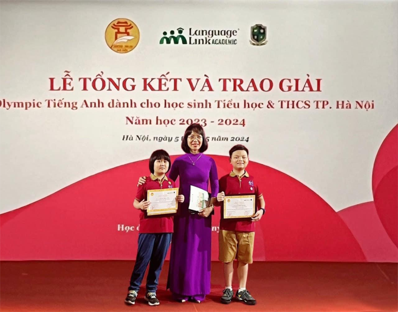 Sáng ngày 05/5, tại nhà hát Âu Cơ đã diễn ra lễ tổng kết và trao giải cuộc thi Olympic Tiếng Anh dành cho học sinh Tiểu học và THCS thành phố Hà Nội năm học 2023 - 2024. Trường Tiểu học Gia Thụy rất vinh dự khi có 02 tài năng Tiếng Anh nhí được tham gia buổi lễ trang trọng này.