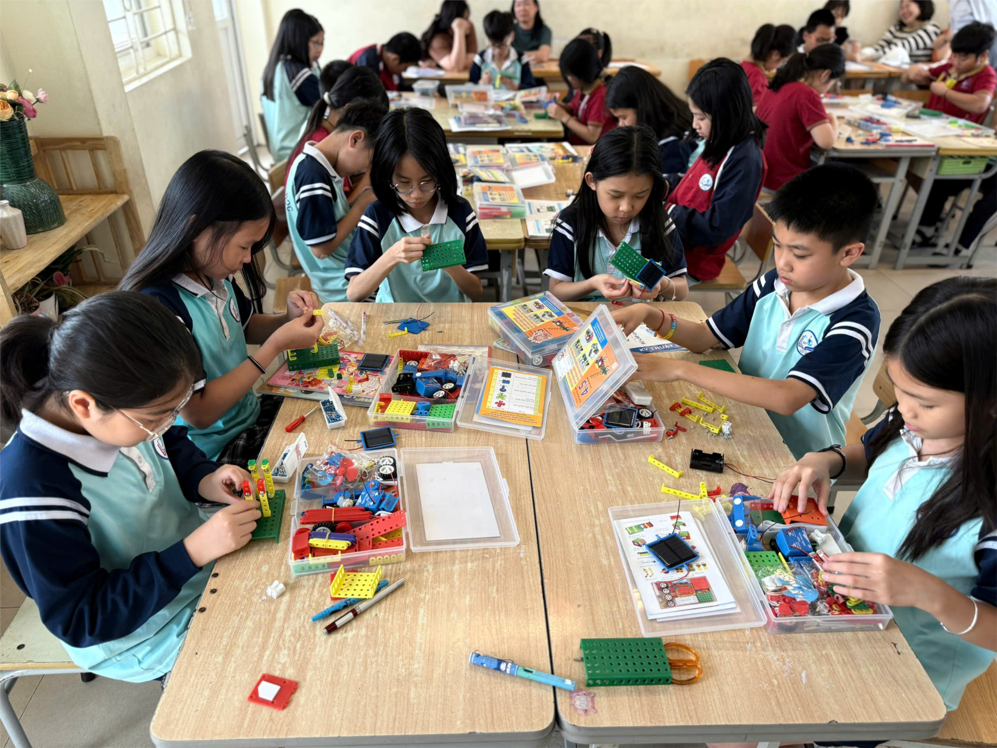 Cô giáo Phạm Thị Hồng Quế đã bắt đầu tiết học bằng việc giới thiệu khái niệm về năng lượng mặt trời và tầm quan trọng của nó trong cuộc sống hiện đại. Cô giải thích cách các tấm pin mặt trời chuyển đổi ánh sáng thành điện năng. Sau phần lý thuyết, học sinh được chia thành các nhóm và nhận các bộ dụng cụ để lắp ráp mô hình điện mặt trời. Các em học sinh đã rất hăng say tham gia vào hoạt động thực hành, chú ý theo hướng dẫn của cô để lắp ráp đúng cách, từ việc kết nối các tấm pin cho đến lắp đặt bóng đèn LED. Khi mô hình hoàn tất, cô Quế đã hướng dẫn các em thực hiện thí nghiệm để kiểm tra mô hình, giúp các em thấy được ánh sáng mặt trời đã chuyển hóa thành điện năng như thế nào, biểu hiện qua việc bóng đèn LED sáng lên.