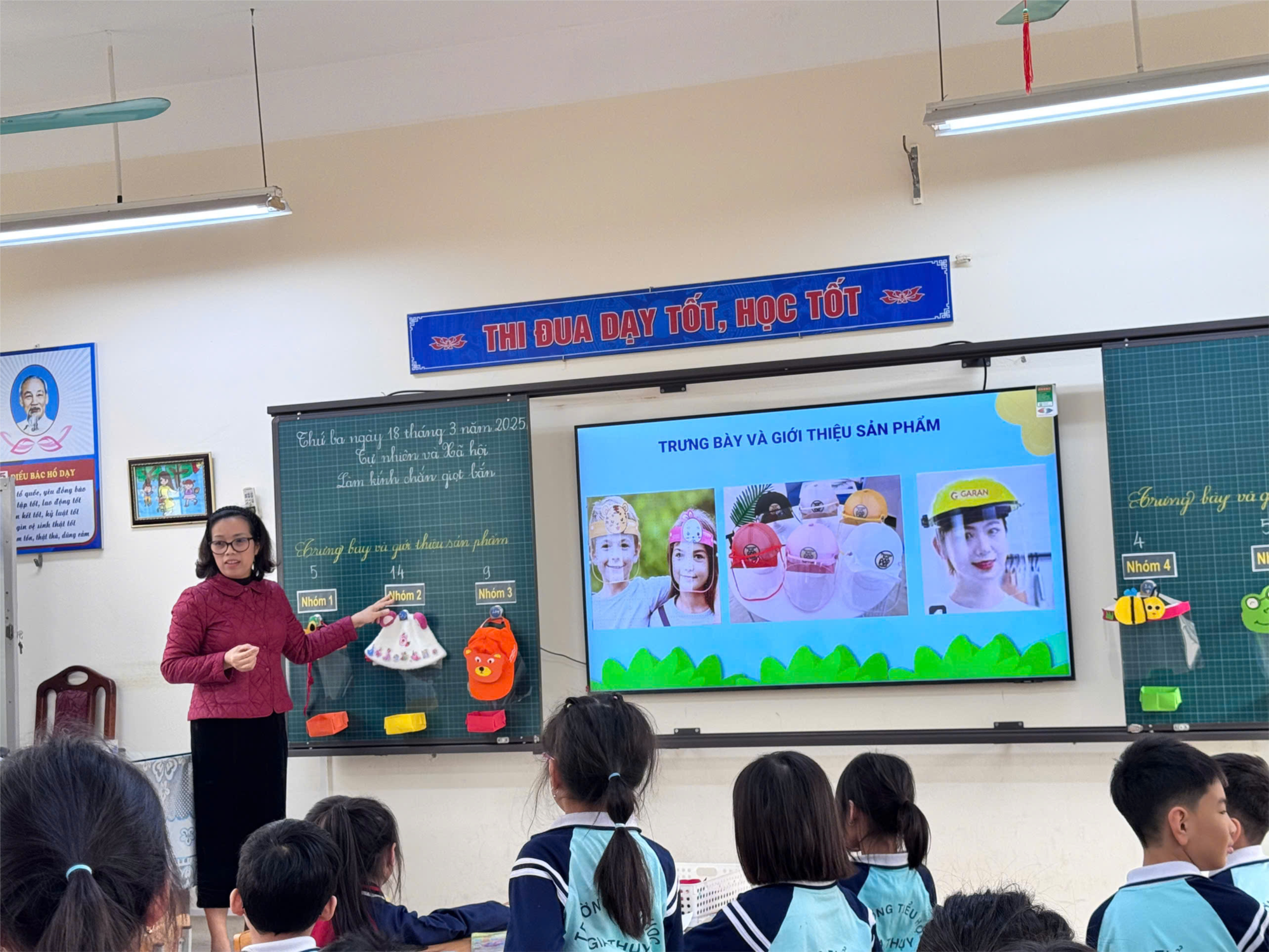 Tiết học không chỉ giúp học sinh hiểu rõ hơn về tầm quan trọng của việc đeo kính chắn giọt bắn mà còn rèn luyện tư duy sáng tạo, kỹ năng thực hành và tinh thần làm việc nhóm. Hoạt động được tổ chức theo phương pháp học tập trải nghiệm với các bước thực hiện như sau: Giáo viên cùng học sinh khởi động và ôn lại kiến thức của tiết học trước, giới thiệu về kính chắn giọt bắn. Sau đó, các em học sinh sẽ thảo luận đề xuất và lựa chọn ý tưởng, cách làm. Các em được chia nhóm, nhận nguyên liệu (tấm nhựa mica, dây thun, băng dính hai mặt, kéo, nẹp nhựa,…) và cùng sáng tạo nên những chiếc kính chắn giọt bắn ngộ nghĩnh đáng yêu. Cuối cùng các nhóm trưng bày sản phẩm của mình và các bạn sẽ bình chọn cho sản phẩm mà mình yêu thích nhất.