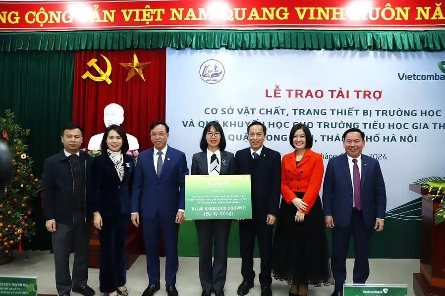 Sau phát biểu của ông Lại Hữu Phước - Ủy viên Ban thường vụ Đảng ủy Vietcombank - Trưởng Ban Kiểm soát Ngân hàng Thương mại Cổ phần Ngoại thương Việt Nam là phần trao tặng kinh phí tài trợ. Ông Nguyễn Bá Minh - Giám đốc Chi nhánh Chương Dương đã trao kinh phí tài trợ cho cô giáo Bùi Thị Thu Hằng – Hiệu trưởng trường Tiểu học Gia Thụy trước sự chứng kiến của các đồng chí lãnh đạo, tập thể CBGVNV, đại diện CMHS và HS nhà trường. Có thể nói đây là nguồn động viên to lớn đối với thầy và trò nhà trường trên chặng đường đổi mới sáng tạo và chuyển đổi số trong giáo dục đào tạo. Thay mặt nhà trường, cô giáo Bùi Thị Thu Hằng đã gửi lời cảm ơn tới các quý vị đại biểu đã có mặt chung vui cùng thầy trò nhà trường, cảm ơn Ngân hàng Thương mại Cổ phần Ngoại thương Việt Nam đã dành nhiều sự quan tâm rất đáng trân quý cho tập thể CBGVNV và HS trường Tiểu học Gia Thụy.