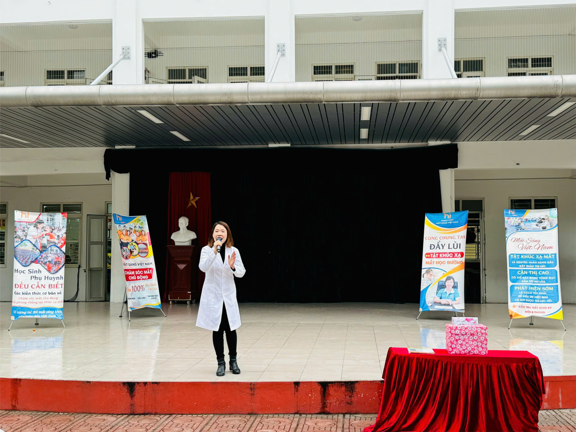 Cô Lệ cũng đã chia sẻ kiến thức cơ bản về tật khúc xạ mắt cùng một số bệnh lý cơ bản hay gặp ở mắt, cách phòng tránh, cách chăm sóc và cách điều trị. Các con rất trật tự lắng nghe cô Lệ giới thiệu về ba khái niệm cơ bản: Thị lực - Khúc xạ - Khả năng điều tiết của mắt. Với cách chuyện trò dí dỏm, gần gũi, cô Lệ đã mang đến cho các bạn học sinh nhiều biện pháp hữu hiệu để chăm sóc chủ động đôi mắt của mình như nên ra ngoài vận động nhiều, chơi các trò chơi sẽ giúp mắt linh hoạt. Nhờ các hoạt động liên tục này mà cơ mắt sẽ khỏe, điều khiển mắt tốt.