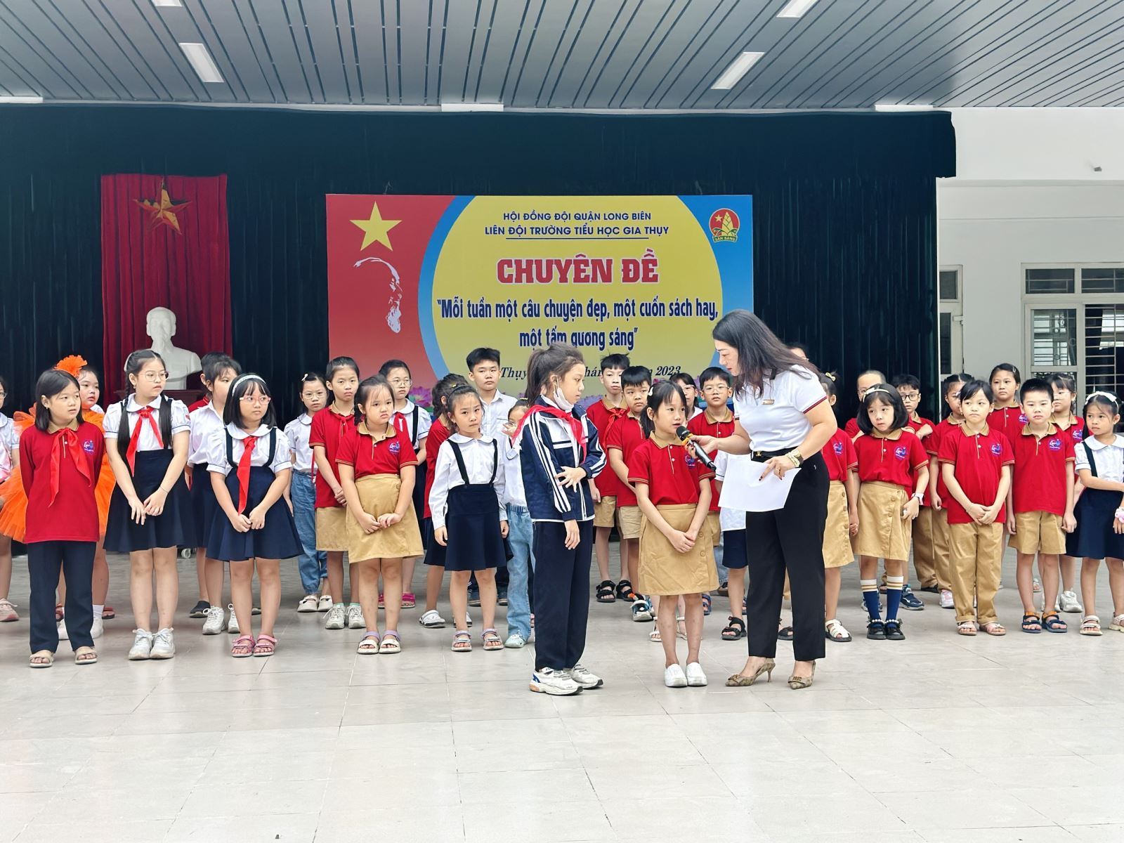 Sáng nay, trong tiết Sinh hoạt dưới cờ của tuần 8, trường Tiểu học Gia Thụy đã tổ chức tuyên dương, khen thưởng các bạn học sinh có việc làm tốt. Đây là việc làm ý nghĩa nằm trong chương trình “Mỗi tuần một câu chuyện đẹp, một cuốn sách hay, một tấm gương sáng” của công tác Đội.