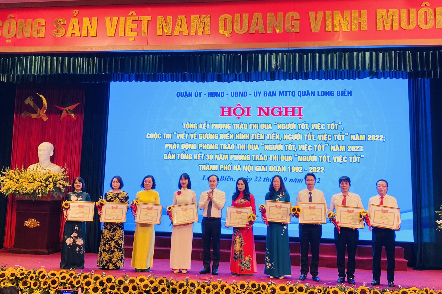 Thứ năm ngày 22/9, Quận ủy, HĐND, UBND, Ủy ban Mặt trận Tổ quốc quận Long Biên đã tổ chức long trọng Hội nghị Tổng kết phong trào thi đua “Người tốt việc tốt”, cuộc thi viết về gương điển hình tiên tiến Người tốt việc tốt năm 2022, phát động phong trào thi đua Người tốt việc tốt năm 2023, gắn tổng kết 30 năm phong trào thi đua Người tốt việc tốt thành phố Hà Nội giai đoạn 1992-2022.