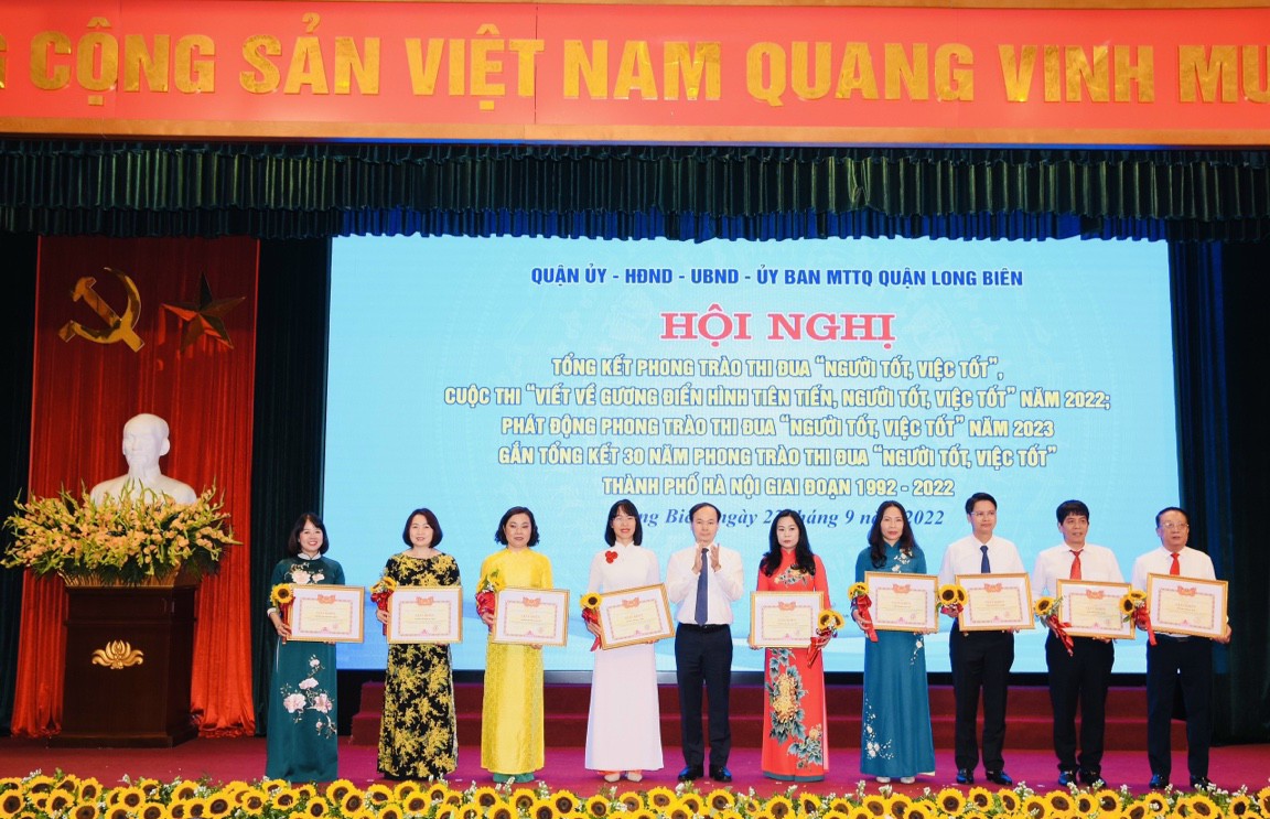Thứ năm ngày 22/9, Quận ủy, HĐND, UBND, Ủy ban Mặt trận Tổ quốc quận Long Biên đã tổ chức long trọng Hội nghị Tổng kết phong trào thi đua “Người tốt việc tốt”, cuộc thi viết về gương điển hình tiên tiến Người tốt việc tốt năm 2022, phát động phong trào thi đua Người tốt việc tốt năm 2023, gắn tổng kết 30 năm phong trào thi đua Người tốt việc tốt thành phố Hà Nội giai đoạn 1992-2022.