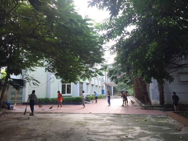 7h00 giờ sáng, các đồng chí cán bộ, giáo viên, nhân viên nhà trường đã có mặt đông đủ. Theo phân công, mỗi tổ chuyên môn phụ trách tổng vệ sinh một khu vực riêng. Nhân viên lao công phụ trách các khu nhà vệ sinh. Ngoài việc quét, dọn sạch rác, phát quang bụi rậm, nhà trường cũng đặc biệt quan tâm đến việc không để nước đọng, úp các bình, xô, chậu…nhằm không tạo môi trường cho muỗi đẻ trứng.