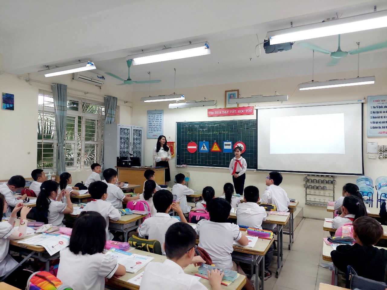 Nhờ sự đầu tư kỹ lưỡng về giáo án, khả năng sử dụng hiệu quả đồ dùng dạy học và kĩ năng sử dụng thành thạo công nghệ thông tin, tiết học đã diễn ra thành công. Cô giáo Trần Lệ Hằng đã truyền cảm hứng vào tiết dạy với lòng yêu nghề và tinh thần nhiệt huyết. Để tạo không khí sôi nổi, mở đầu tiết học giáo viên cho học sinh khởi động qua bài hát : “Đèn giao thông”. Lần lượt qua từng hoạt động các bạn học sinh lớp 3A8 đã được tìm hiểu và nêu được ý nghĩa của một số biển báo giao thông. Cô giáo Lệ Hằng còn dạy các bạn nhỏ bài thơ An toàn giao thông giúp HS ghi nhớ thật nhanh các biển báo giao thông. Các bạn học sinh lớp 3A8 với tinh thần học tập sôi nổi, hào hứng, chủ động tiếp thu bài học hiệu quả và có ý thức tuân thủ các quy định khi tham gia giao thông.