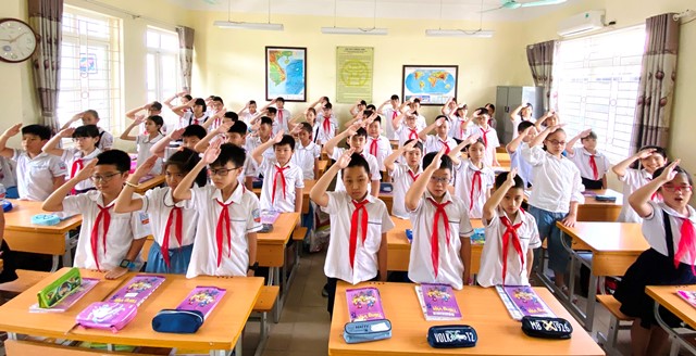 Trước tình hình dịch bệnh vẫn còn diễn biến phức tạp, để đảm bảo an toàn cho học sinh, tránh tụ tập đông người, trong những tuần đầu của năm học mới 2020-2021, nhà trường tiếp tục thực hiện nghi lễ Chào cờ tại các lớp học. Thay vì rục rịch xếp ghế dưới sân trường trong tiếng nhạc vui tươi, thì nay, sau hồi trống hiệu, học sinh vẫn tự giác với việc truy bài đầu giờ. Tiếng đọc bài ê a vang khắp sân trường. Như chuẩn bị từ trước, đúng 8h, tiếng đọc bài dứt hẳn, trong 1 phút, bầu không khí trang nghiêm ôm lấy khuôn viên toàn bộ ngôi trường. Từ các lớp học, giai điệu hào hùng của bài Quốc ca đồng loạt vang lên mang theo niềm tự hào dân tộc, lòng quyết tâm, sự hứng khởi trong học tập của mỗi học sinh. Kết thúc bằng lời đồng thanh hô đáp khẩu hiệu, sân trường trở lại vẻ yên tĩnh vốn có.