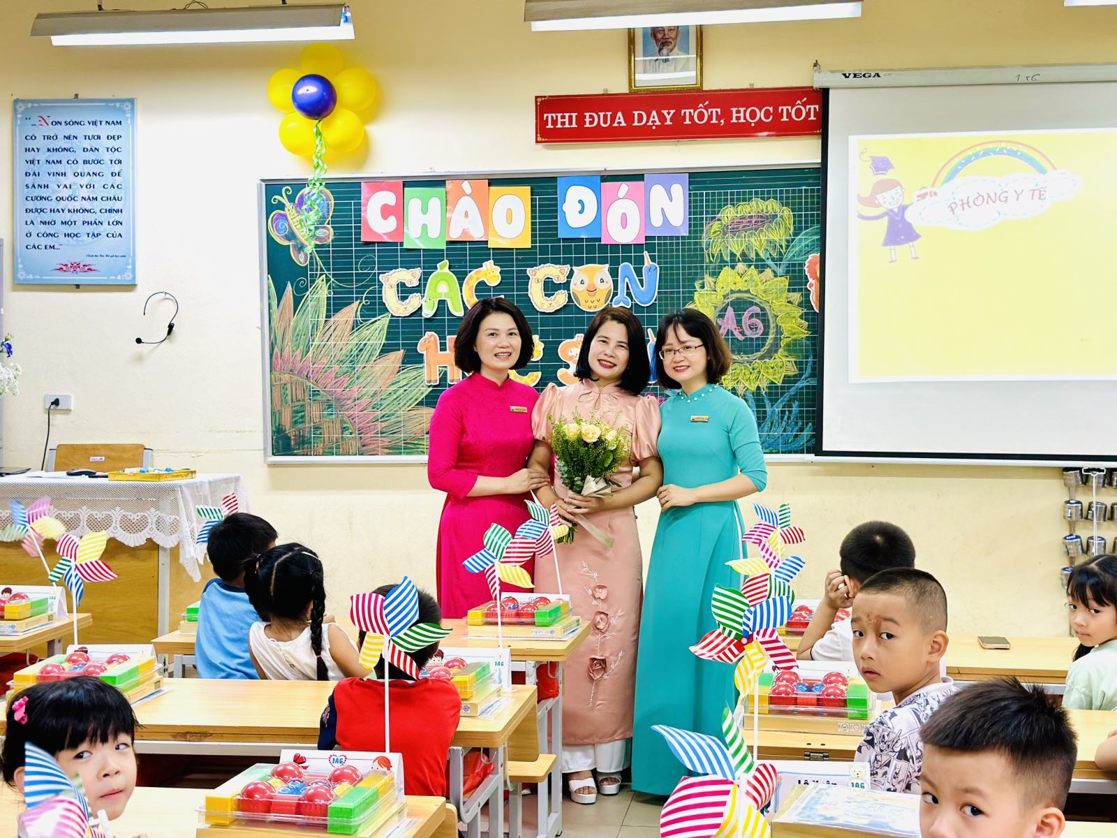 Không còn ánh mắt rụt rè, lo âu, mà thay vào đó là những nụ cười giòn tan, những ánh mắt rạng rỡ niềm vui khi các con được giao lưu làm quen các bạn mới và tham gia các trò chơi thật lí thú tại lớp học của mình. Và có lẽ điều bất ngờ nhất với các con học sinh là được hai cô giáo Phó Hiệu trưởng nhà trường tới động viên, tặng hoa chúc mừng trong ngày đầu tiên đến lớp.