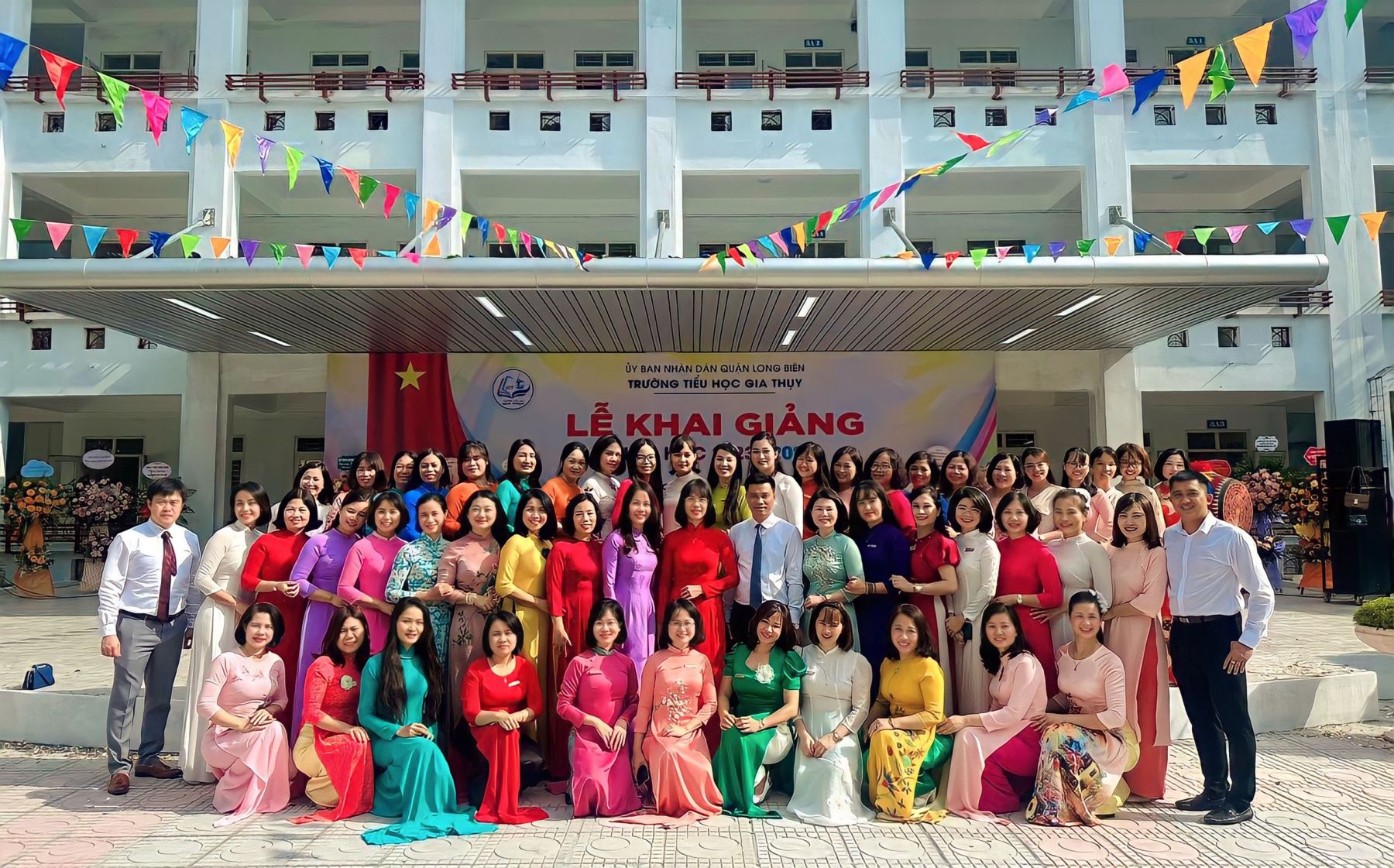Sân trường Tiểu học Gia Thụy hôm nay thật rực rỡ không chỉ bởi cờ hoa mà nổi bật hơn cả là hình ảnh cô trò trong tà áo dài duyên dáng thướt tha, với những bộ đồng phục chỉnh tề, những gương mặt ngây thơ, hồn nhiên của các em học sinh.