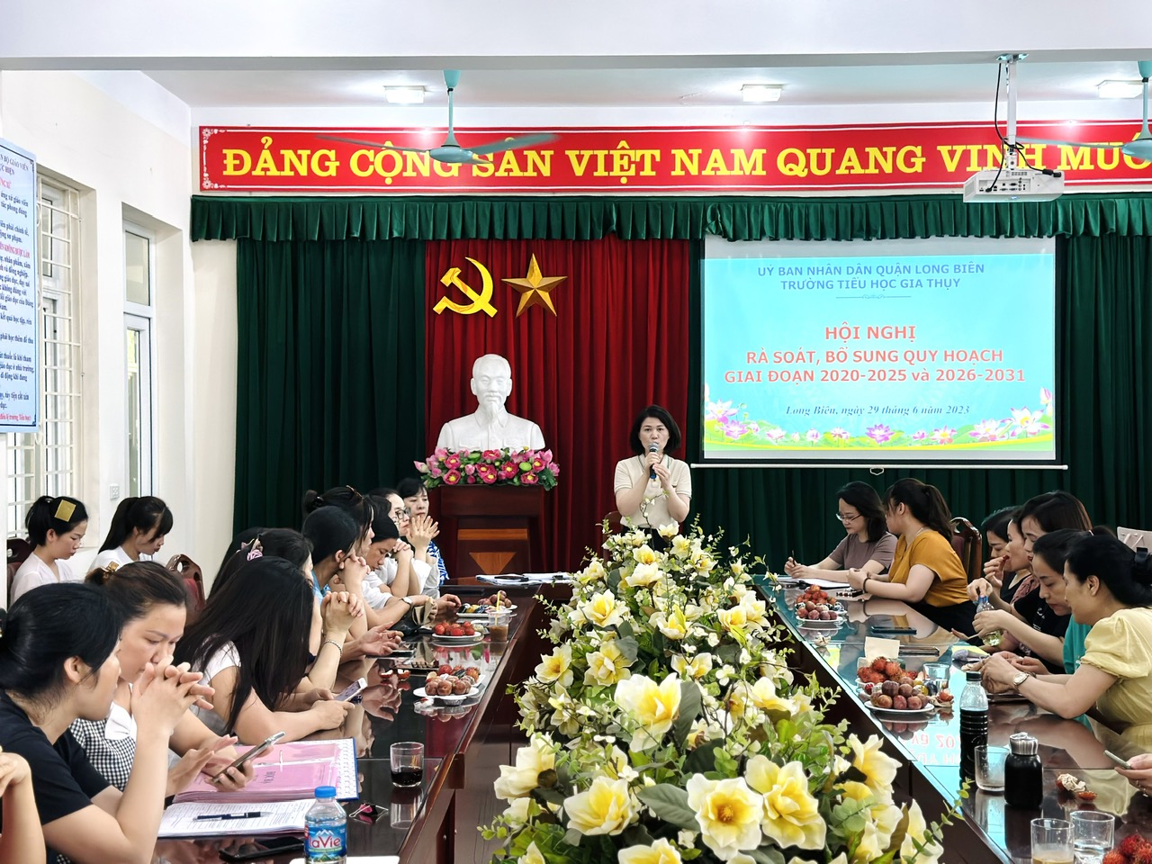 Thực hiện Kế hoạch số 112-KH/QU ngày 08/4/2022 của Ban Thường vụ Quận ủy Long Biên về việc rà soát, bổ sung quy hoạch nhiệm kỳ hiện tại, xây dựng quy hoạch cán bộ nhiệm kỳ kế tiếp đối với cấp ủy, các chức danh cán bộ diện Ban thường vụ Quận ủy quản lý, sáng ngày 29/6/2023, trường Tiểu học Gia Thụy đã tổ chức Hội nghị rà soát, bổ sung quy hoạch giai đoạn 2020-2025 và 2026-2031.