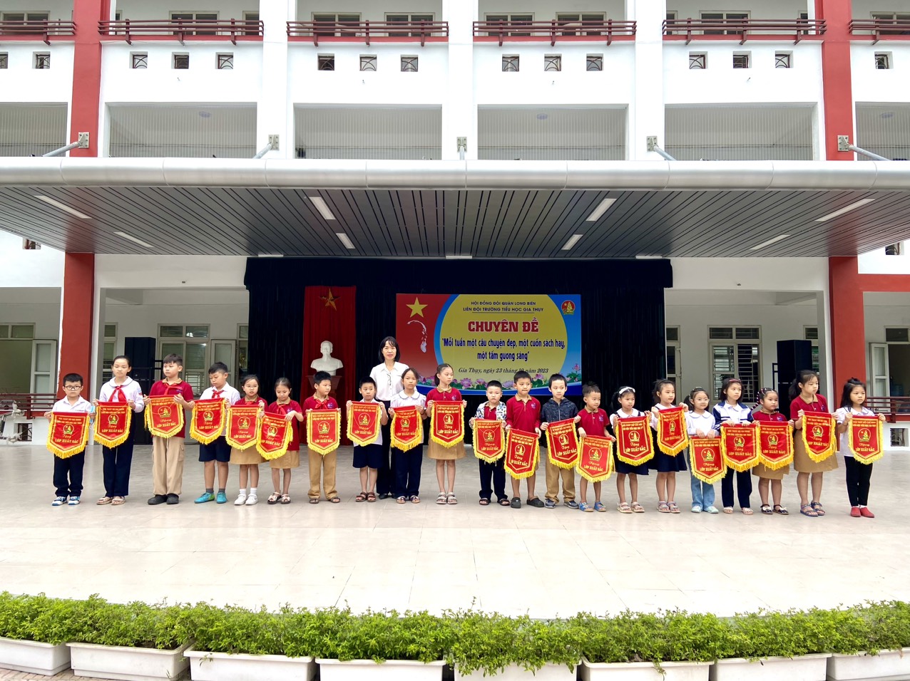 Sáng ngày 23/10/2023, trường Tiểu học Gia Thụy long trọng tổ chức lễ chào cờ và chuyên đề "Mỗi tuần một câu chuyện đẹp, một cuốn sách hay, một tấm gương sáng".
