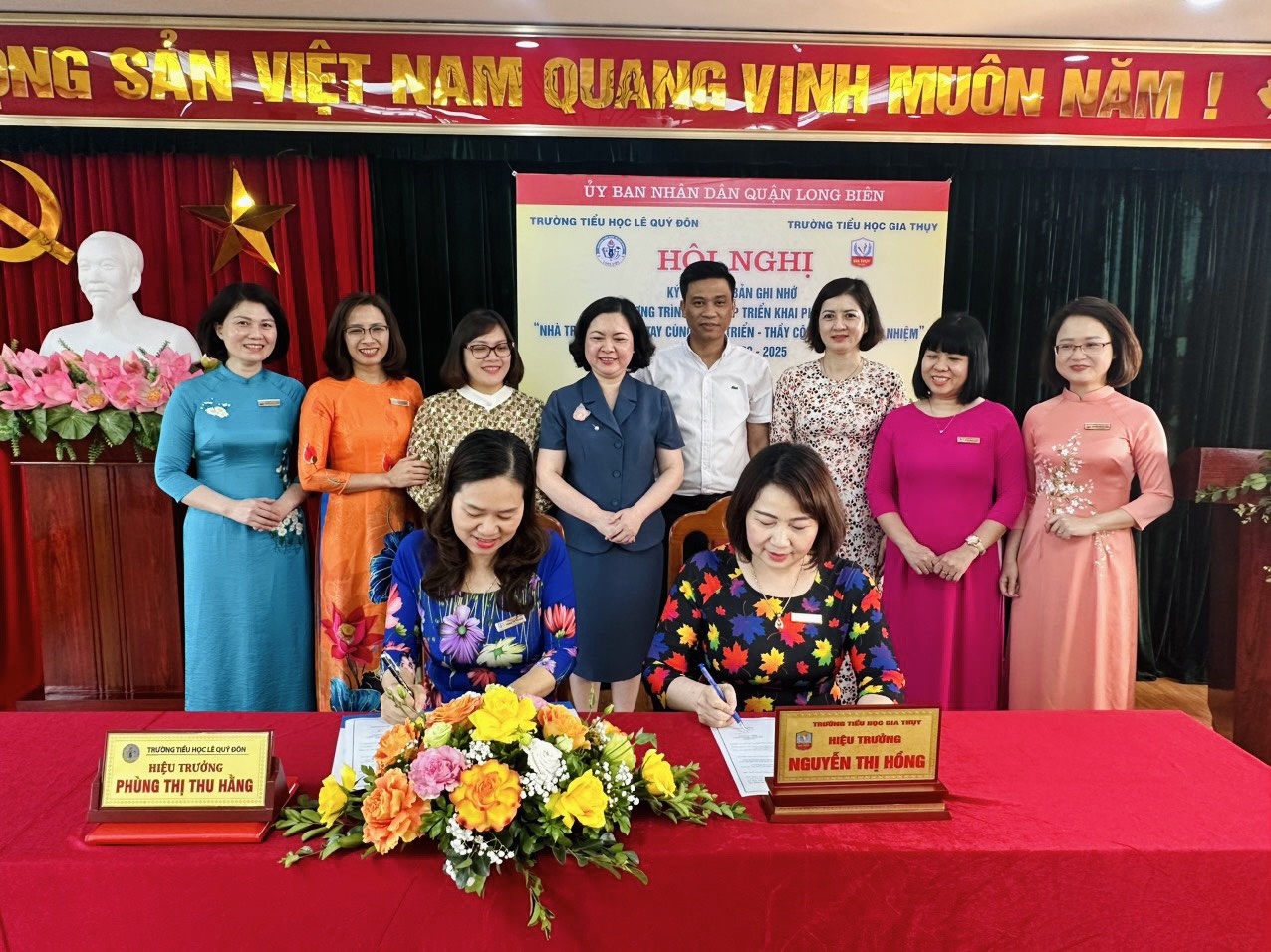 Với sự chứng kiến của các đ/c lãnh đạo, chuyên viên Phòng Giáo dục và Đào tạo quận Long Biên, các đ/c cán bộ, giáo viên, đ/c Nguyễn Thị Hồng và đ/c Phùng Thị Thu Hằng đã đặt bút kí vào biên bản ghi nhớ đánh dấu một khởi đầu tốt đẹp cho tình đoàn kết, gắn bó, cùng chung tay phát triển, cùng sẻ chia trách nhiệm của hai trường. Hội nghị kết thúc trong những tràng pháo tay giòn giã, trong niềm vui hân hoan của toàn thể các đại biểu. Chắc chắn, Tiểu học Gia Thụy và Tiểu học Lê Quý Đôn sẽ kề vai sát cánh, sẽ là “đôi bạn cùng tiến”, đưa hai ngôi trường ngày càng trưởng thành, vững mạnh.
