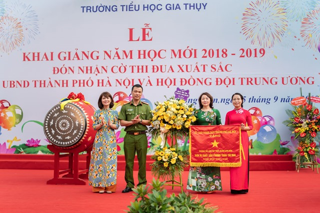 Trong không khí long trọng của buổi lễ, nhà trường vinh dự được đón nhận Cờ thi đua Xuất sắc trong phong trào thi đua của UBND Thành phố Hà Nội và Cờ dẫn đầu thi đua Công tác Đội và phong trào thiếu nhi của Hội đồng Đội trung ương năm học 2017 - 2018. Đây là những thành tích cao quý và là nguồn cổ vũ, động viên thầy trò trường Tiểu học Gia Thụy quyết tâm vượt mọi khó khăn vươn lên đạt nhiều thành tích trong năm học 2018 - 2019. Đồng chí hiệu trưởng khái quát những nhiệm vụ trọng tâm trong năm học và phát động thi đua trong toản thể cán bộ, giáo viên, nhân viên và các em học sinh tích cực thi đua dạy tốt học tốt, phấn đấu hoàn thành thắng lợi nhiệm vụ năm học 2018 – 2019.