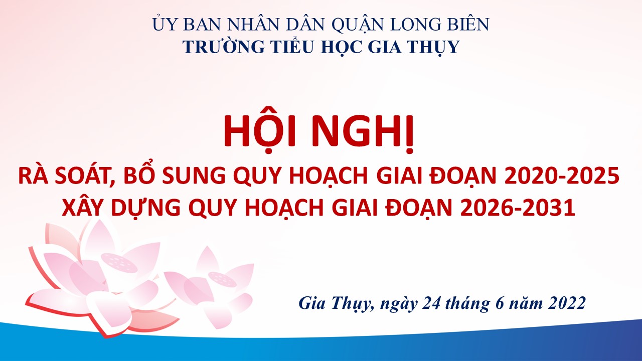 Thực hiện kế hoạch số 112-KH/QU ngày 08/4/2022 của Quận ủy Long Biên về việc rà soát, bổ sung quy hoạch nhiệm kỳ hiện tại, xây dựng quy hoạch cán bộ nhiệm kỳ kế tiếp đối với cấp ủy, các chức danh cán bộ diện Ban Thường vụ Quận ủy quản lý, sáng ngày 24/6/2022, trường Tiểu học Gia Thụy đã tổ chức hội nghị rà soát, bổ sung quy hoạch giai đoạn 2020-2025 và xây dựng quy hoạch giai đoạn 2026-2031.